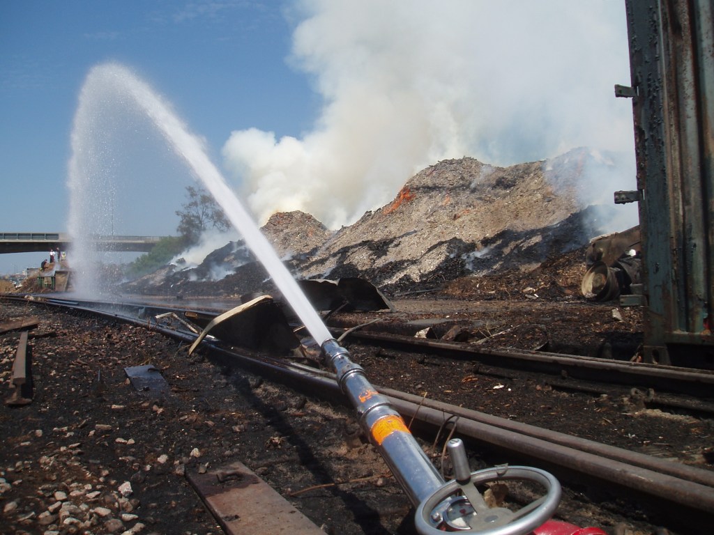 A large fire in a pile of shredded wood that had heated up and ignited spreading to nearby buildings, which took 100 Firefighters 3 days to extinguish. during the summer of 2005, Staples Corner, NW London (authors collection).