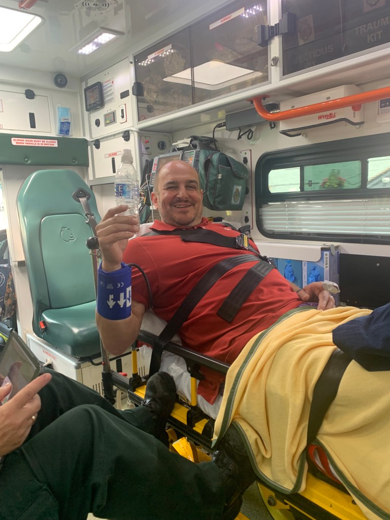 Cheers!!! In the ambulance looking better than I felt.
