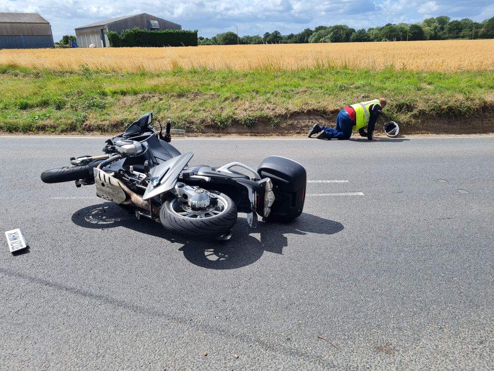I was riding along Ockenden Road in Upminster, just past the Stubbers Outdoor centre and on a long lazy bend, not going too fast, just a relaxing Sunday ride. Ahead of me was Pike Lane, a small country lane to my left. I noticed a white Vauxhall Mokka edging out and typically scanned to see if the driver had seen me, she was looking left I was to her right, the car still edging forward. I instantly hit the brakes, still looking left she accelerated out of the junction just as the fantastic Brembo brakes on my bike brought me to a very rapid and controlled stop… thank you bike, you did your job brilliantly. The last meter or so until she hit me passed in slow motion. I saw her coming, still looking left, but even though this played out slowly, second by second in real life, it was too quick for me to hit my horn or do anything.